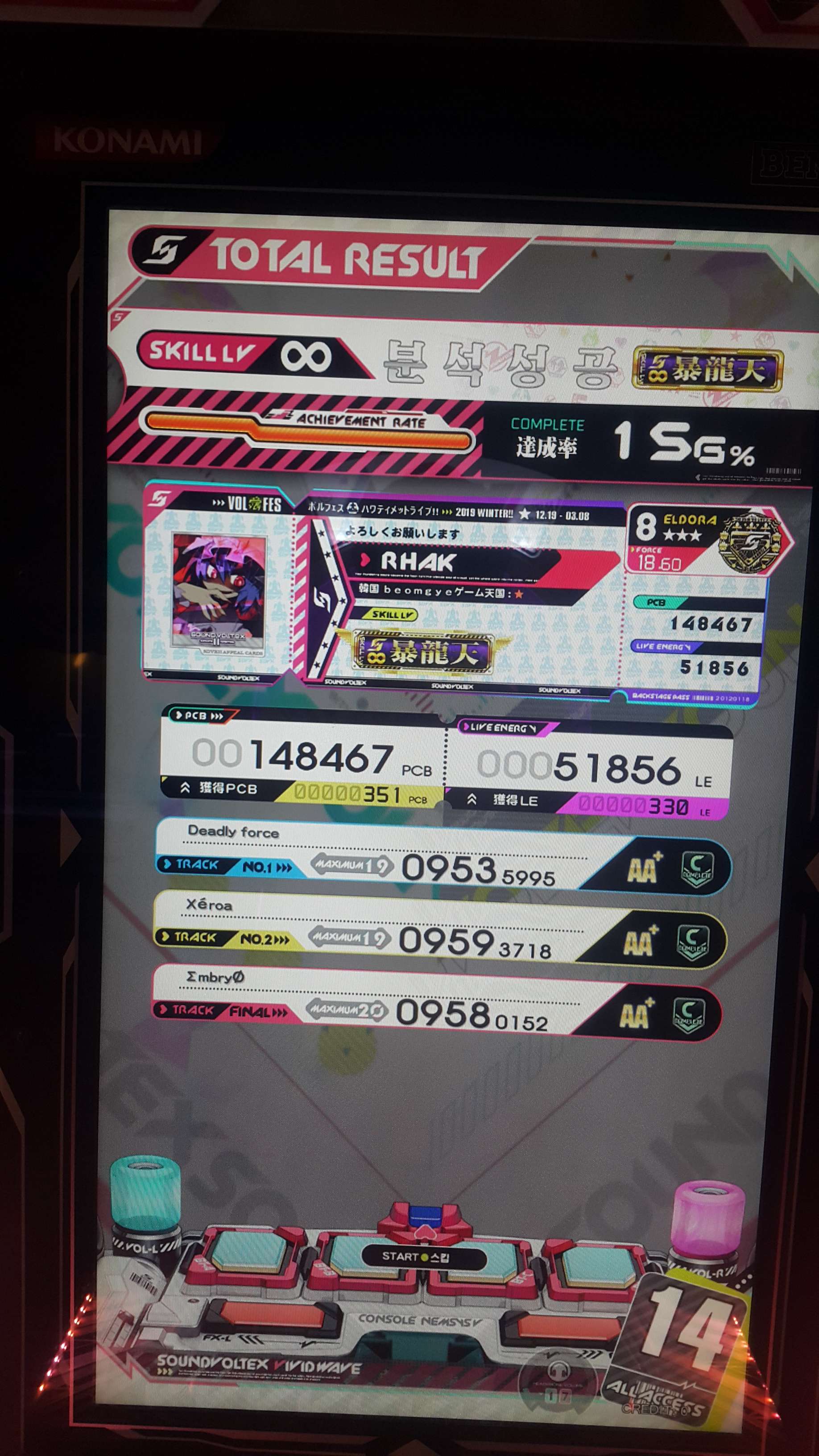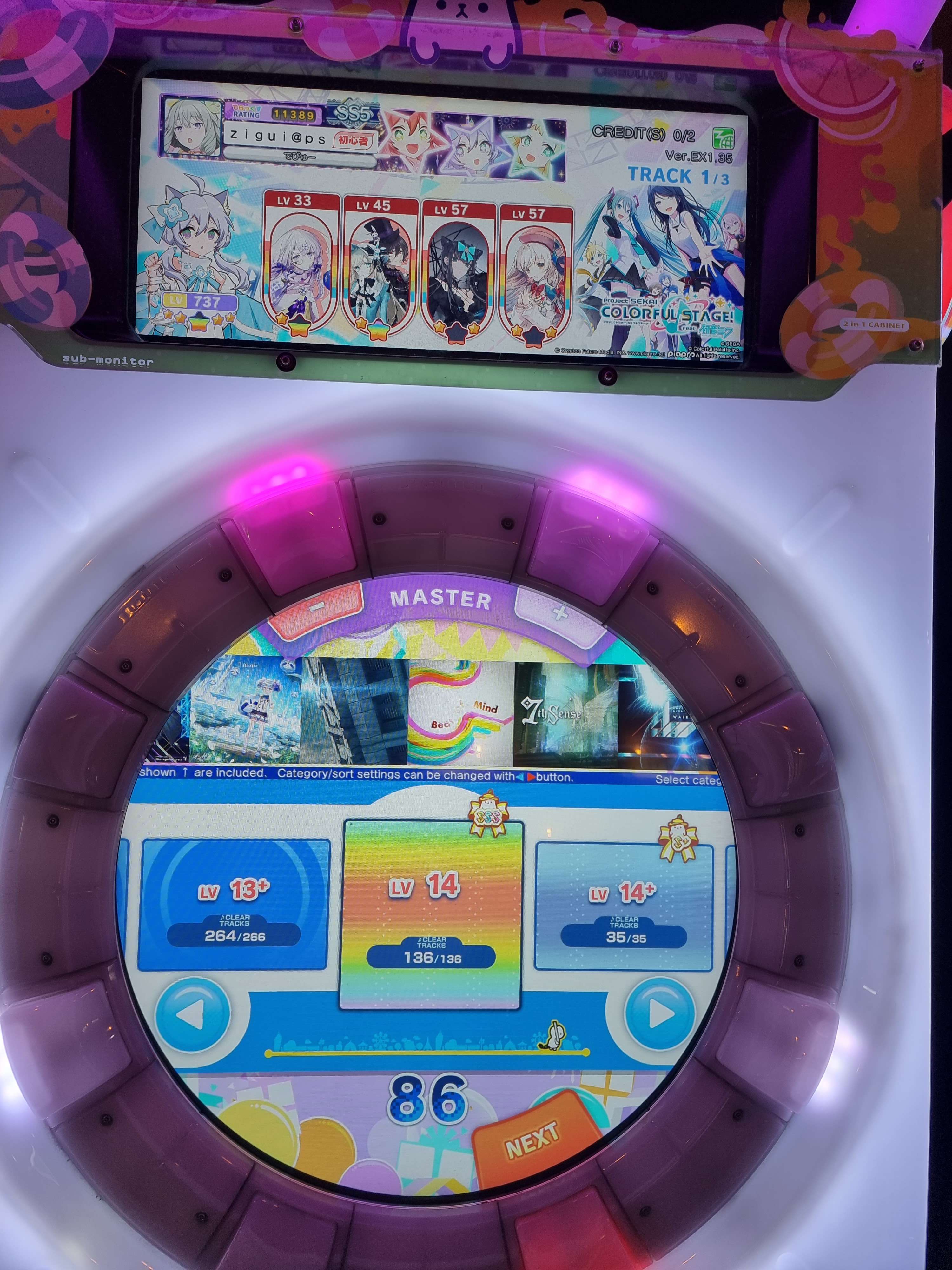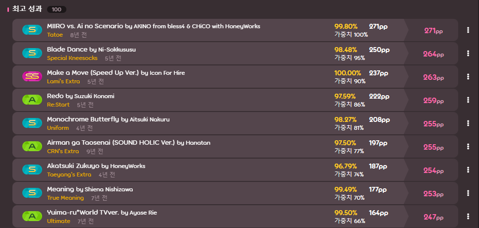 가장 큰 성과는 신버전 기준 14렙 전곡 SSS 정도이고, 14+은 전곡 SS까지 쿠리마 하나 남았습니다.