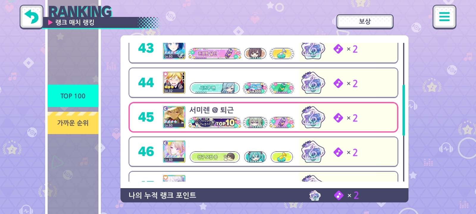 현재 진개전 17, 칭호는 성스러운밤 이벤트 10위와 네네 11랭을 달고있습니다. 랭크 매치는 스샷 기준 마스터 2포 45위. 신곡을 제외하고는 31 이하 전곡 AP까지 비터초코 하나 남았고, 32 AP가 3개(히바나, 브뉴데, 테오) 있습니다. 풀콤작은 안하구요.