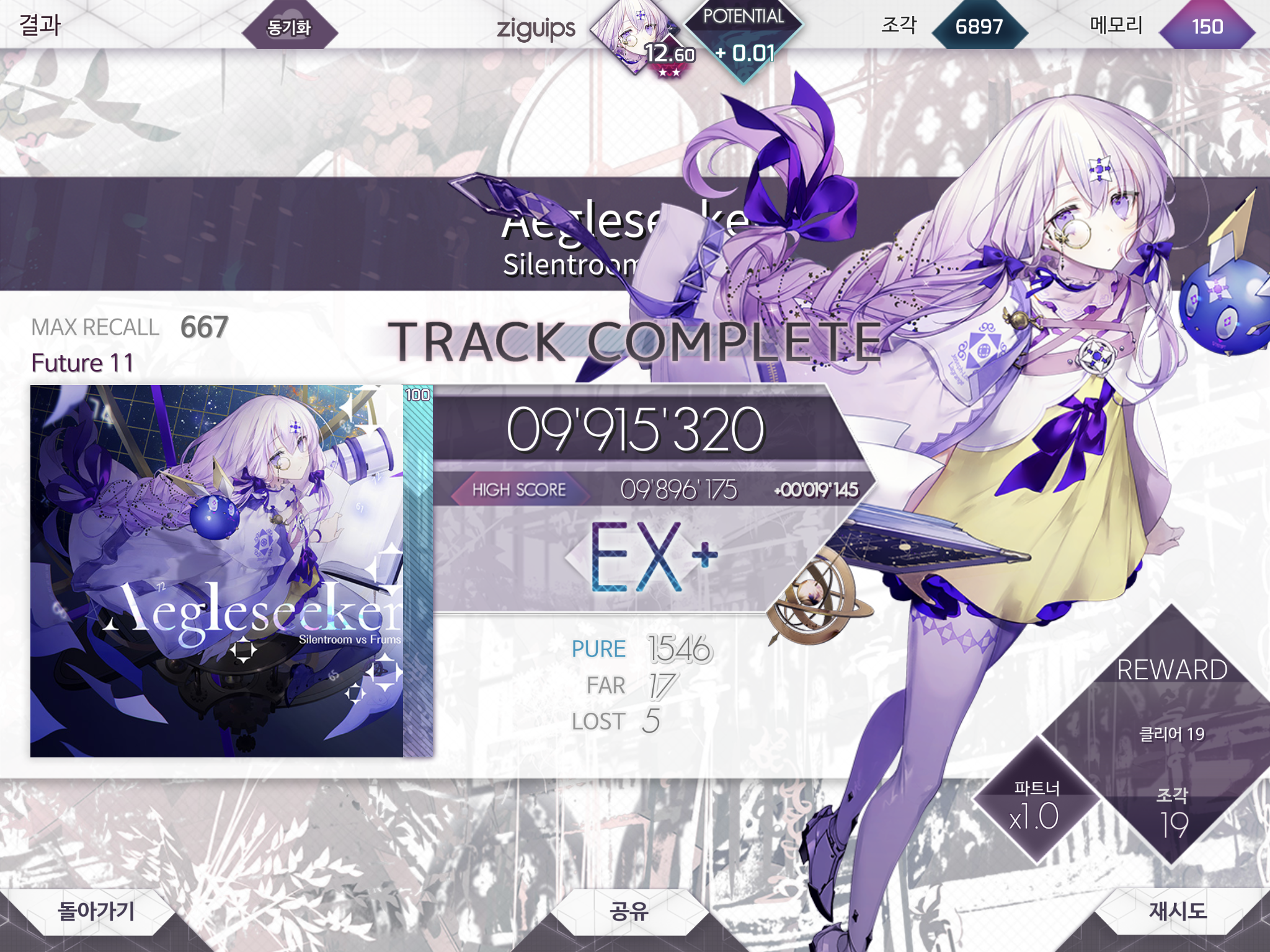 레이팅은 Aegleseeker 나올 때 기준 12.60이고, 전곡 EX+까지 템비욘 재규어 남았었습니다.